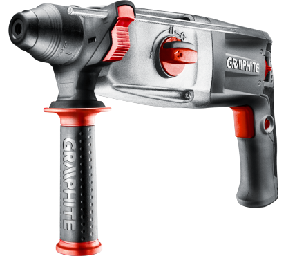 Czterofunkcyjna młotowiertarka SDS+ GRAPHITE o dużej mocy 900W, posiada funkcje wiercenia z udarem, wiercenia bez udaru, funkcję podkuwania oraz wyjątkową możliwość bezstopniowej regulacji kąta ustawienia dłuta do precyzyjnego podkuwania.