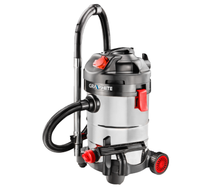 Wysokiej klasy odkurzacz warsztatowy GRAPHITE z silnikiem o mocy 1500 W, przeznaczony do szybkiego i skutecznego usuwania urobku po pracach warsztatowych.