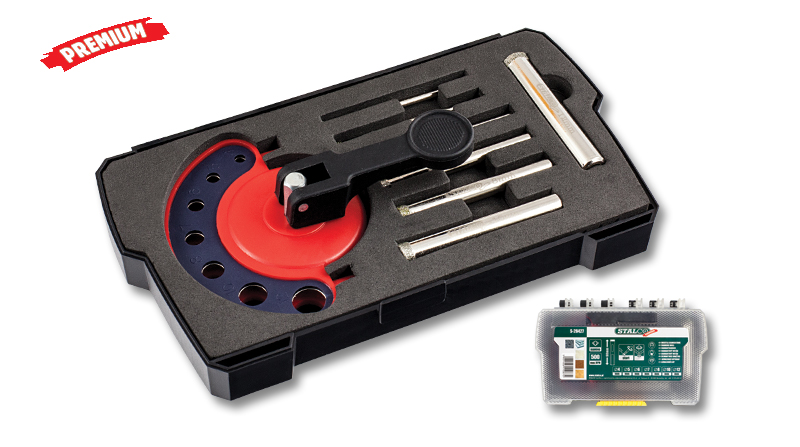 Zestaw wierteł niezastąpiony przy bezudarowym wierceniu otworów w szkle,marmurze, granicie i materiałach ceramicznych. Umożliwiają szybkie i precyzyjne wiercenie otworów pod kołki rozporowe. Krawędzie tnące pokryte nasypem diamentowym bardzo wysokiej jakości umożliwiają wiercenie w najtwardszych materiałach. Toczony korpus z jednego kawałka stali zapewnia bardzowysoką precyzję i zapobiega jego odkształcaniu podczas wiercenia. Uchwyt prowadzący z mocną przyssawką i kanałem wodnym pozwalającym na precyzyjne prowadzenie wiertła podczas wiercenia oraz jego chłodzenia.