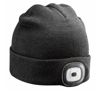 Czapka z latarką, latarka odporna na wodę (IP43 - ochrona przed natryskiwaniem wodą pod dowolnym kątem do 60° od pionu z każdej strony), ładowana przez USB, 3 poziomy natężenia światła (100%, 75%, 50%)