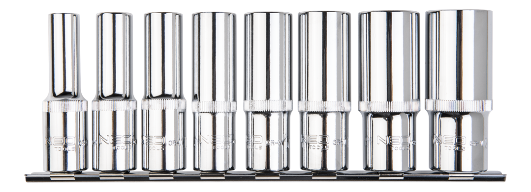 Nasadki Spline długie 1/2" NEO w zestawie 8 sztuk w popularnych rozmiarach (od 10 do 24 mm). Wykonane z wytrzymałej stali chromowo-wanadowej. Sferyczny kształt nasadek daje bardzo szerokie zastosowanie, umożliwiając odkręcanie śrub Torx, Spline, 12-kątnych, metrycznych, calowych i kwadratowych. Jakość narzędzia potwierdzona certyfikatem TÜV i 25-letnią gwarancją producenta.