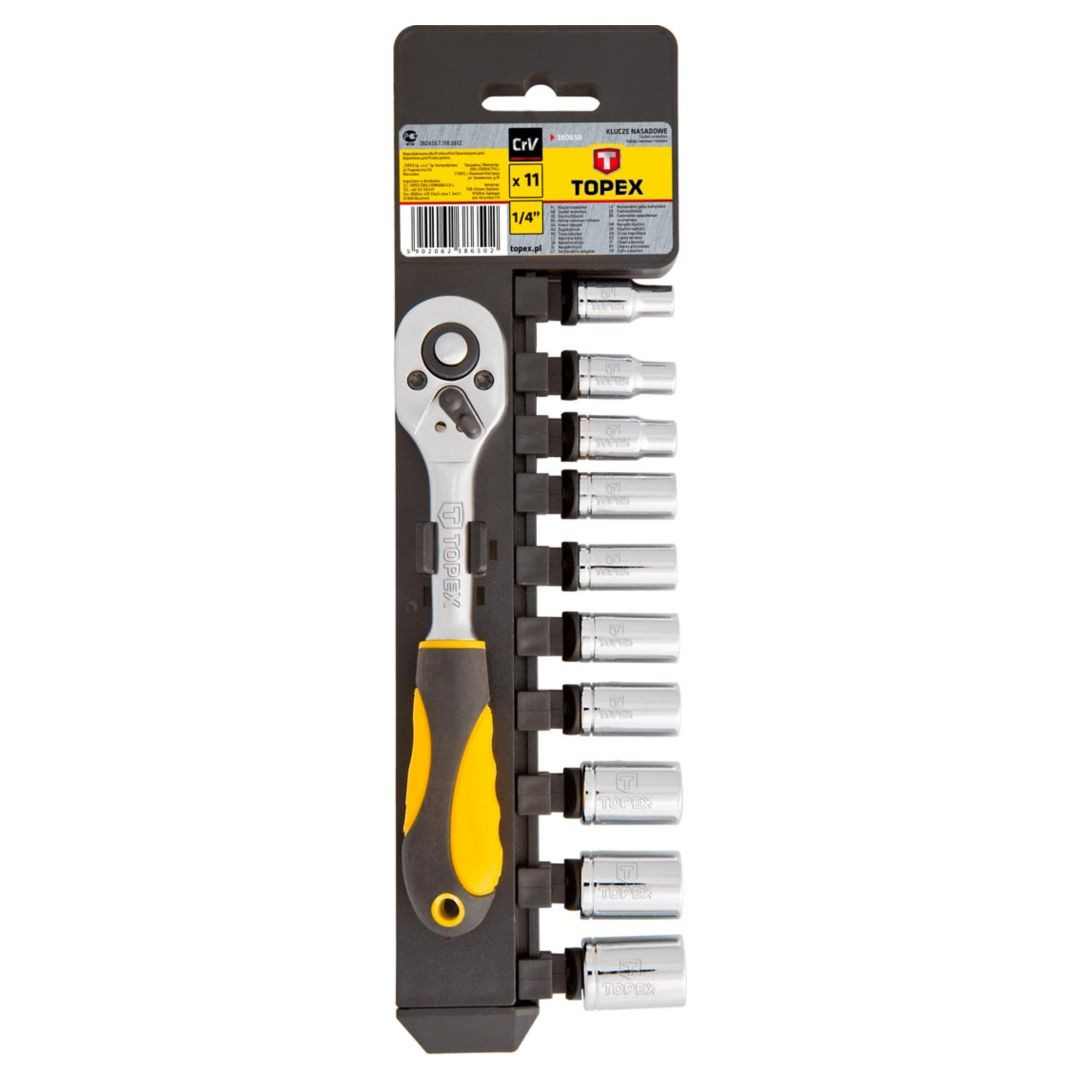 Zestaw kluczy nasadowych 1/4” TOPEX ma wszechstronne zastosowanie w drobnych pracach montażowych, naprawach pojazdów i maszyn oraz innych pracach w domu i garażu każdego majsterkowicza. Wszystkie elementy wykonane są z wysokiej jakości stali chromowo-wanadowej zapewniającej długoletnią żywotność narzędzi. W zestawie znajduje grzechotka z ergonomiczną rękojeścią z tworzywa sztucznego, pokrytą antypoślizgowym materiałem, co zapewnia wygodę i bezpieczeństwo podczas pracy oraz 10 nasadek sześciokątnych. Wszystko umieszczone na praktycznym wieszaku z tworzywa sztucznego.