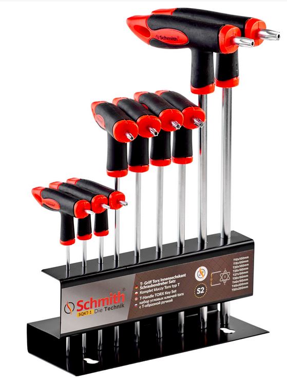 Zestaw kluczy imbusowych z uchwytem typu T wykonnaych ze stali S2 zapewniającej długowieczność i wytrzymałość końcówek. Rękojeść wykonana z tworzywa sztucznego oraz gumy zapewnia pewny chwyt i najwyzszy komfort pracy.
