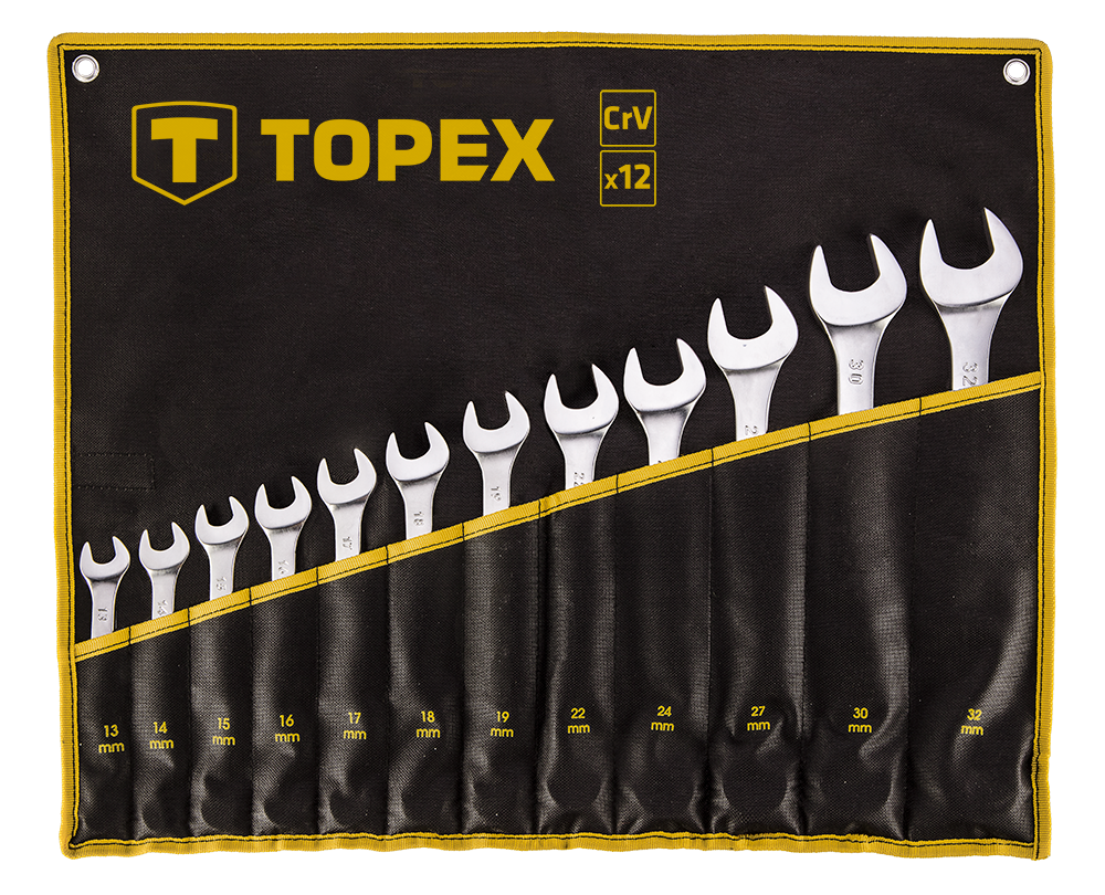 Klucze płasko-oczkowe 13-32 mm, zestaw 12 szt., stal CrV, rozmiary: 13, 14, 15, 16, 17, 18, 19, 22, 24, 27, 30, 32