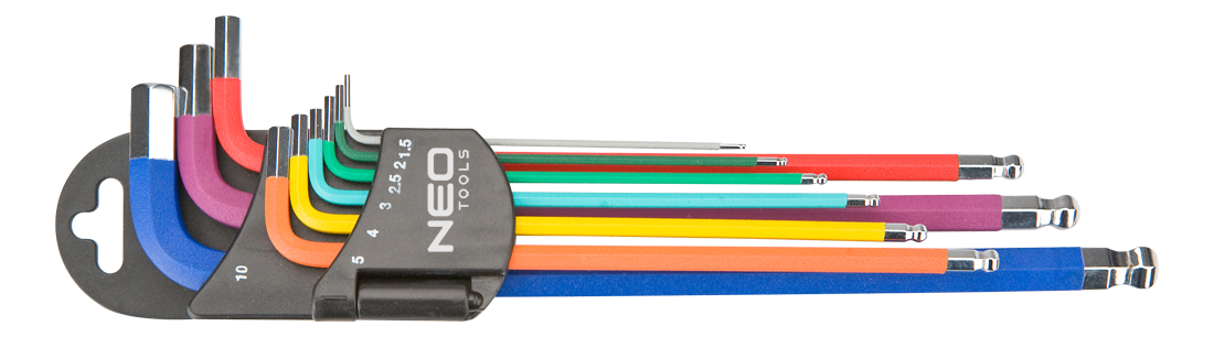 Zestaw kluczy sześciokątnych NEO wykonany zgodnie z normą DIN 911. Zestaw zawiera 9 kluczy w rozmiarze od 1.5 do 10 mm w praktycznym opakowaniu. Kuliste końcówki o kącie roboczym do 30° zwiększają funkcjonalność narzędzi. Kolorowy kod ułatwia wybór rozmiaru. Wysokogatunkowa stal stopowa SNCM+V zapewnia długoletnią wytrzymałość kluczy. Certyfikat TÜV, ISO 2936 i 25-letnia gwarancja producenta potwierdzają wysoką jakość narzędzia.