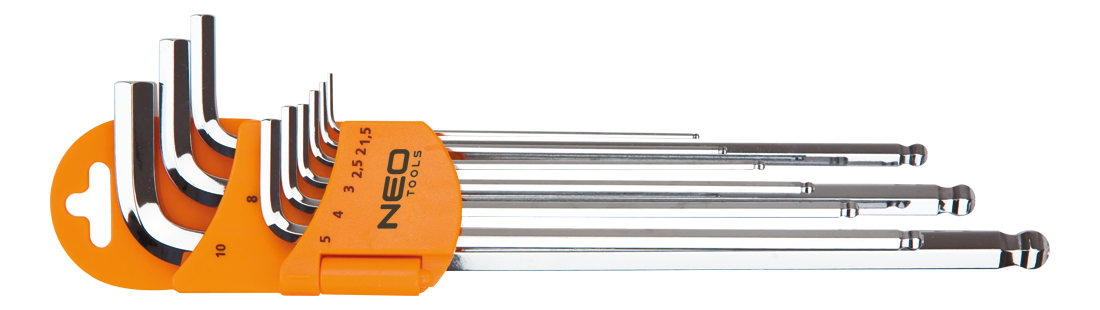 Zestaw kluczy sześciokątnych NEO wykonany zgodnie z normą DIN 911. Zestaw zawiera 9 kluczy w rozmiarze od 1.5 do 10 mm w praktycznym opakowaniu. Magnetyczne, kuliste końcówki o kącie roboczym do 30° zwiększają funkcjonalność narzędzi. Wysokogatunkowa stal stopowa S2 zapewnia długoletnią wytrzymałość kluczy. Certyfikat TÜV, ISO 2936 i 25-letnia gwarancja producenta potwierdzają wysoką jakość narzędzia.