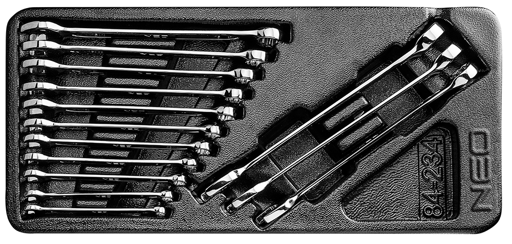 Zestaw kluczy płasko-oczkowych NEO zawiera 14 kluczy w popularnych rozmiarach (od 6 do 19 mm), wykonanych zgodnie z normą DIN 3113. Wysokogatunkowa stal chromowo-wanadowa zapewnia długoletnią wytrzymałość kluczy. Narzędzia dostarczane są w praktycznej wytłoczce z tworzywa, pasującej do szuflad szafek narzędziowych NEO 84-221 i 84-222. Niezawodność produktu potwierdza 25-letnia gwarancja.