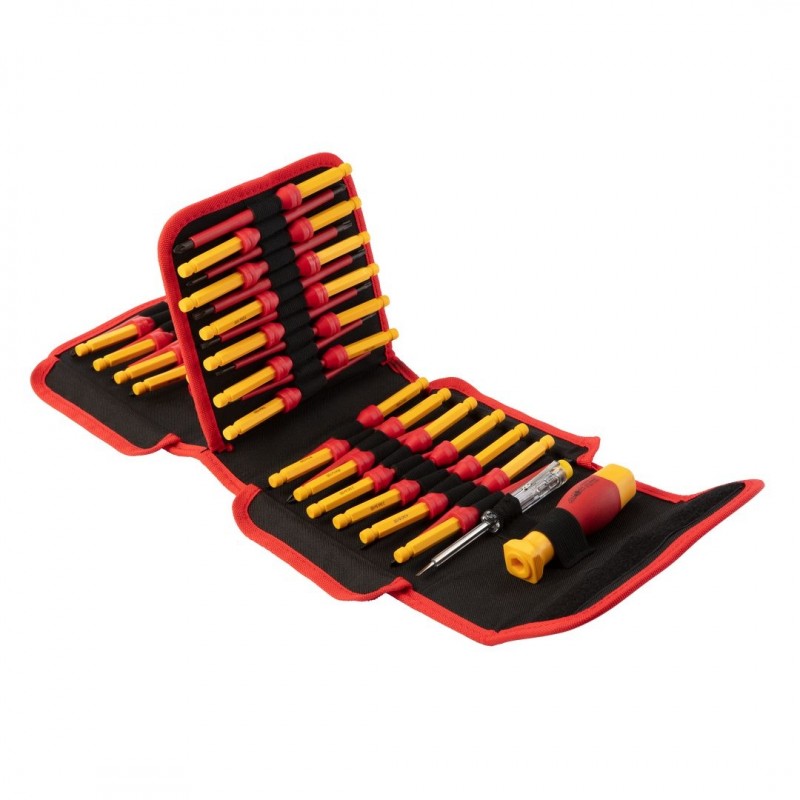 Zestaw końcówek wkrętakowych NEO, składający się z 50 elementów atestowanych do pracy pod napięciem do 1000 V. Dzięki zastosowaniu stali stopowej S2 twardość końcówek wynosi 50 HRC, co wydatnie poprawia trwałość i jakość ich pracy. Zestaw zawiera bogaty pakiet standardowych i specjalistycznych typów końcówek o długości 100 mm. Uzupełnieniem zestawu jest próbnik elektryczny 1000V.