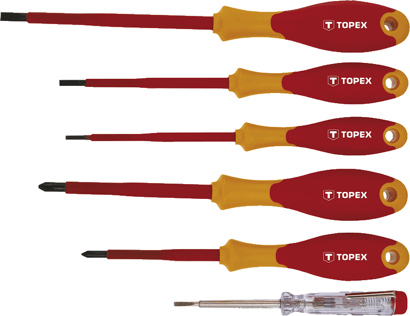 Zestaw wkrętaków TOPEX przeznaczonych do prac pod napięciem do 1000V. Każdy z pięciu wkrętaków wykonany z wysokiej jakości stali chromowo-molibdenowej, izolowany. Dodatkowo w komplecie próbnik instalacji elektrycznej 125 - 250V. Ergonomiczny uchwyt z tworzywa sztucznego pokryty antypoślizgowym materiałem zapewnia komfort i bezpieczeństwo podczas pracy.