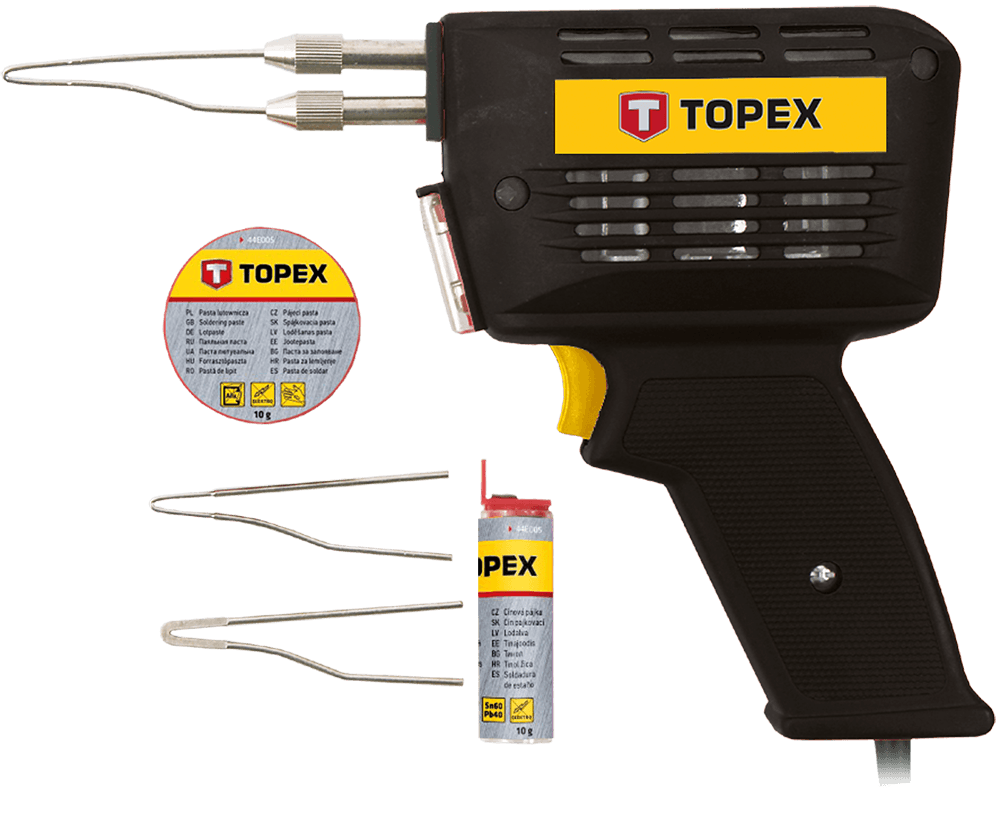 Lutownica transformatorowa TOPEX o mocy 150W. Służy do łączenia metalowych części za pomocą niskotopliwego spoiwa np. cynowo-ołowiowego do lutowania miękkiego. Jest szczególnie przydatna przy łączeniu elementów o większym przekroju np. elektryczne instalacje samochodowe, elektryczne instalacje domowe niskiego napięcia oraz przy innych pracach wymagających zwiększonej temperatury nagrzewania. Posiada wbudowaną żarówkę podświetlającą miejsce lutowania co znacznie podnosi komfort pracy. Spakowana w praktyczną walizkę, w zestawie z pastą lutowniczą i lutem cynowym. Zgodność z europejskimi standardami bezpieczeństwa zapewnia certyfikat CE.