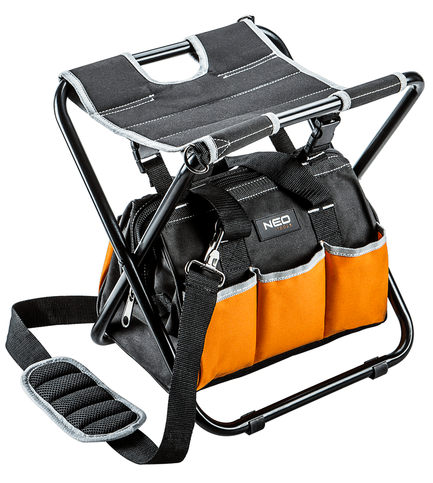 Stołek z torbą monterską poliester 600D, 6 kieszeni zewnętrznych, pasek na ramie, uchwyt, klamry na torbę.