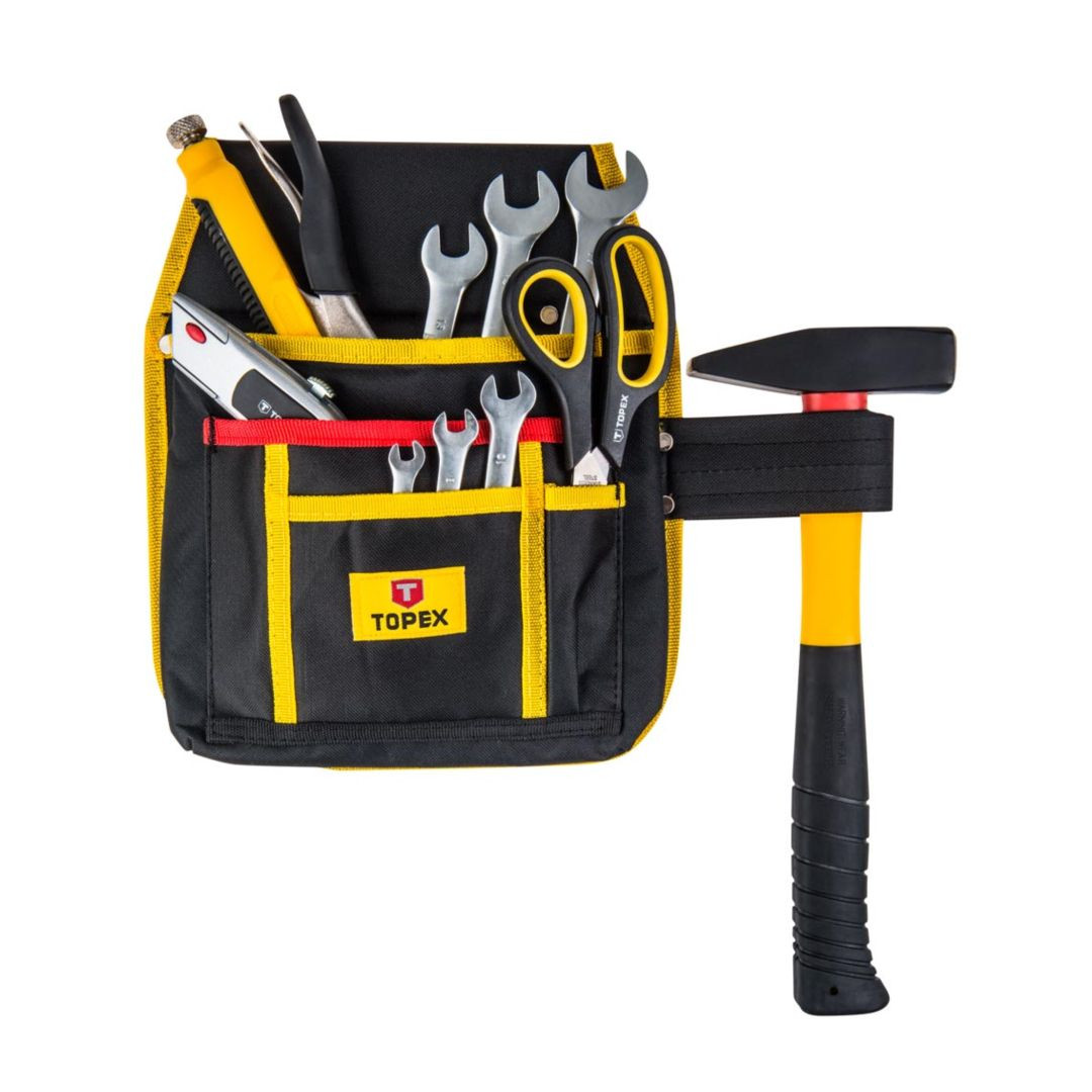 Kieszeń na narzędzia TOPEX wykonana z wytrzymałego tworzywa sztucznego. Posiada 4 przegrody na narzędzia oraz uchwyt umożliwiający podwieszenie młotka. Montowana do paska od spodni. Kieszeń na narzędzia, 4 przegrody, uchwyt na młotek, materiał cordura