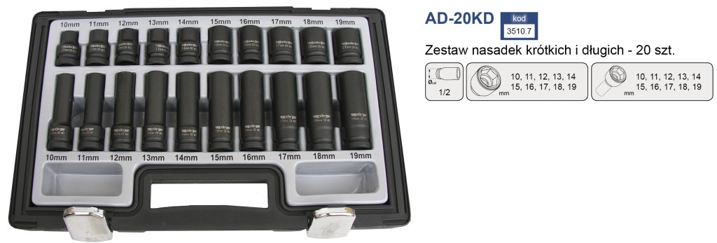 Zestaw AD-20KD zawiera 10 sztuk krótkich i 10 sztuk długich nasadek udarowych w najbardziej popularnych rozmiarach.