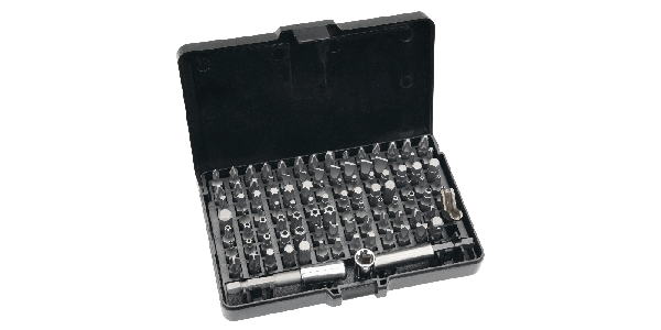 Końcówki wkrętakowe z uchwytem, zestaw 99 szt., 2 szt. uchwyt 1/4, 60 mm, magnetyczny, 95 szt. końcówek wkrętakowych 25 mm, stal S2, rozmiary: płaskie 3, 4, 4.5, 5.5, 6, 6.5, 7, 8 mm, krzyżowe PH0, PH1, 5 x PH2, PH3, PZ0, 2 x PZ1, 5 x PZ2, PZ3, Torx T8, T10, T15, T20, T25, T27, T30, T40, T45, Torx z otworem TT8, TT10, TT15, TT20, TT25, TT27, TT30, TT35, TT40, sześciokątne H1.5, H2, H2.5, H3, H4, H5, H5.5, H6, H8, sześciokątne calowe H1, 16, H5, 64, H3, 32, H7, 64, H1, 8, H9, 64, H5, 32, H3, 16, H7, 32, H1, 4, sześciokątne z otworem H2, H2.5, H3, H4, H5, H6, sześciokątne z otworem calowe H5, 64, H3, 32, H7, 64, H1, 8, H9, 64, H5, 32, Spline M5, M6, M8, kwadrat No0, No1, No2, No3, trzyskrzydłowe 6, 8, 10 mm, dwuskrzydłowe 2, 3, 4 mm, czteroskrzydłowe 4, 6, 8, 10 mm, serwisowe: 1, 2, 3 mm, 50 mm, adapter do końcówek, uchwyt do haków, etui z tworzywa, certyfikat TÜ