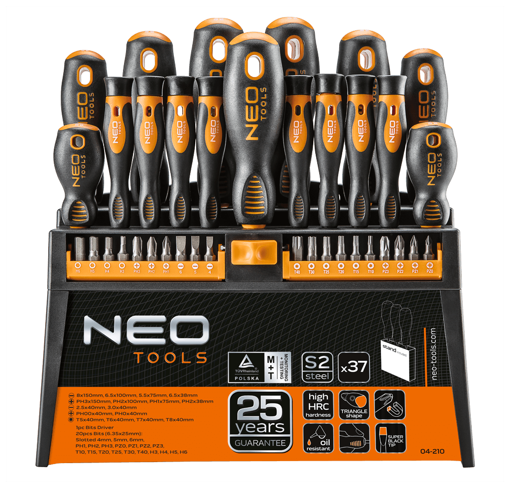 Zestaw wkrętaków i końcówek wkrętakowych NEO (nr ref. 04-210) zawiera 37 wysokiej jakości elementów. Grot każdego wkrętaka wykonany z bardzo wytrzymałej stali S2, zapewniającej długą żywotność. Wkrętaki posiadają magnetyczną końcówkę. Trójgraniasty kształt uchwytu z wyprofilowanym oparciem dla kciuka zmniejsza obciążenie dłoni podczas pracy i ułatwia uzyskanie optymalnego momentu obrotowego. Uchwyt dwumateriałowy zapobiega ślizganiu się w dłoni, odporny jest na działanie chemikaliów, olejów i smarów. Jakość narzędzia potwierdzona 25-letnią gwarancją producenta. To wszystko, razem z 8 najwyżzsej jakości wkrętakami precyzyjnymi oraz 20 bitami o różnych kształtach i rozmiarach, zamknięte w poręcznym stojaku ułatwiającym przechowywanie. Marka NEO spełnia oczekiwania profesjonalistów.
