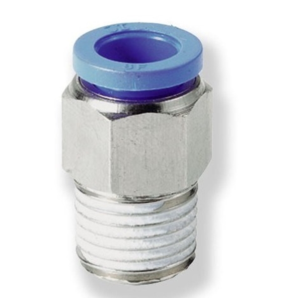 Łącznik wtykowy prosty z gwintem zewnętrznym na wąż to element umożliwiający sprawne połączenie przewodów poliuretanowych, poliamidowych oraz polietylenowych z innymi elementami układu pneumatycznego lub hydraulicznego. Połączenie następuje poprzez zacisk przewodów w złączce i wkręcenie złączki w odpowiednie gniazdo gwintowane.