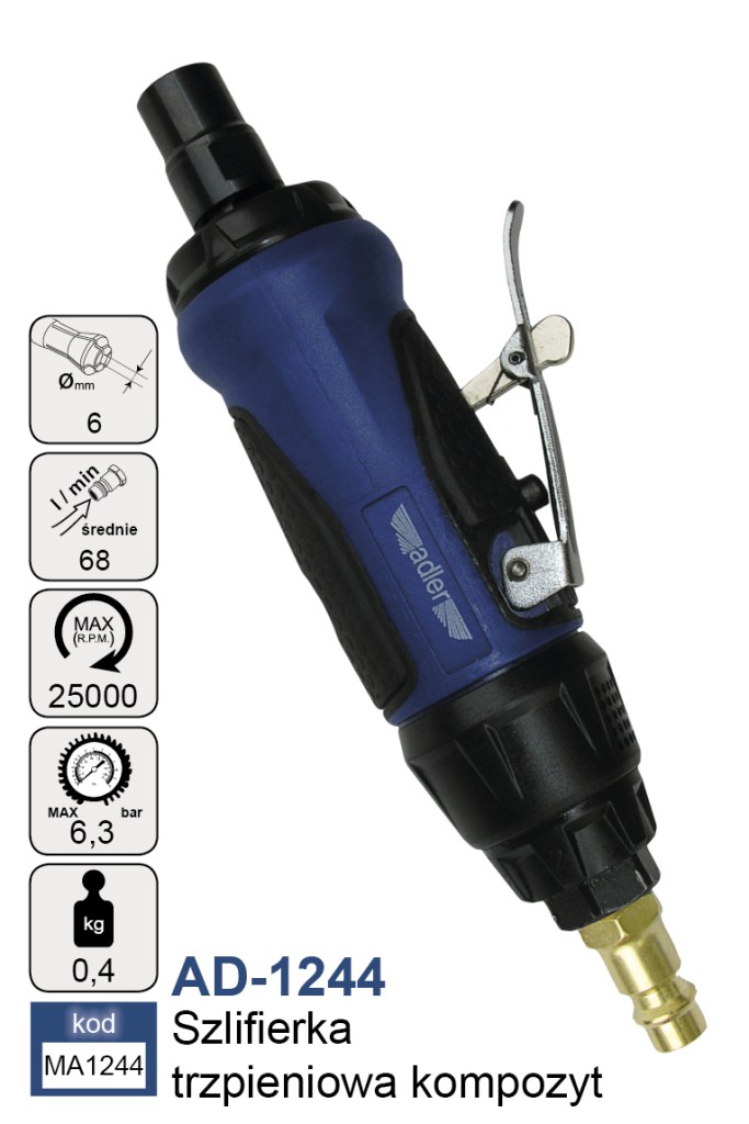 Duża zaletą modelu AD-1244 jest lekka kompozytowa obudowa, która ma wpływ na funkcjonalność i wygodę użytkowania urządzenia. Ponadto szlifierka wyposażona jest w pokrętło regulujące liczbę obrotów na zasadzie dławienia przepływu powietrza.