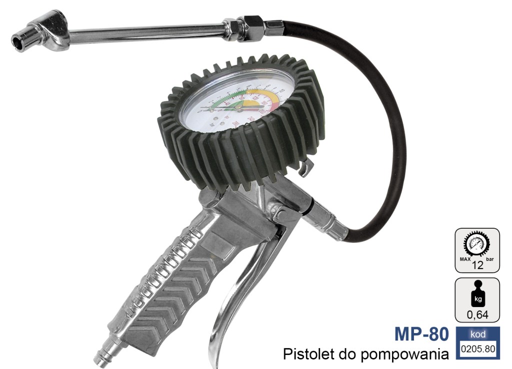 Pistolet do pompowanie MP-80 jest przeznaczony do amatorskiego, prywatnego i półprofesjonalnego wykorzystania. Do pompowania kół samochodowych, rowerowych a także innych dmuchanych przedmiotów np za pomocą specjalnych końcówek. Posiada większy, czytelniejszy wskaźnik ciśnienia (manometr), który jest chroniony gumową osłoną zabezpieczającą przed przypadkowymi uszkodzeniami mechanicznymi. Pistolet wyposażony jest także w długą metalową końcówkę.