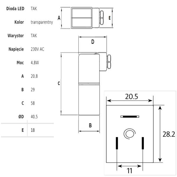 CEWKA Z WTYKIEM I DIODĄ LED na napięcie 230V AC